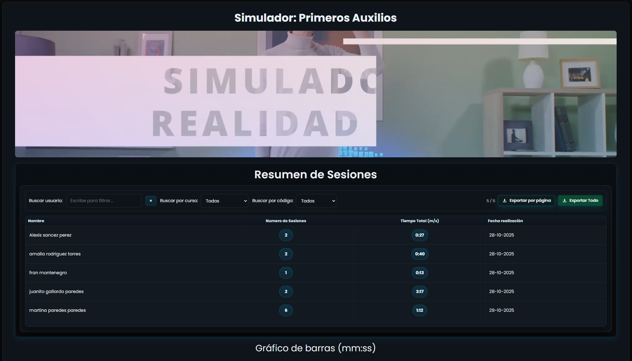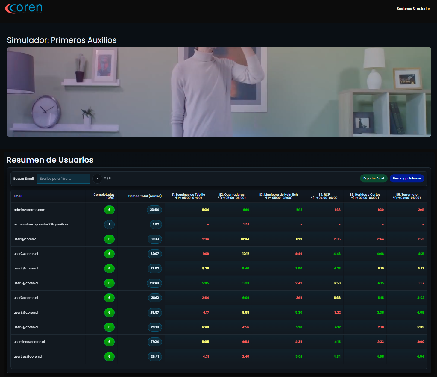 Simulador.coren.cl Clientes.coren.cl Plataforma de Monitoreo en Tiempo Real Esta web centraliza los datos de los simuladores VR, permitiendo visualizar el desempeño de todos los participantes simultáneamente y en vivo. A través de un dashboard intuitivo, los instructores pueden supervisar métricas clave al instante, detectar errores y evaluar el progreso de cada usuario durante la sesión, facilitando el control total del entrenamiento desde un único lugar. Contamos con una web analitica